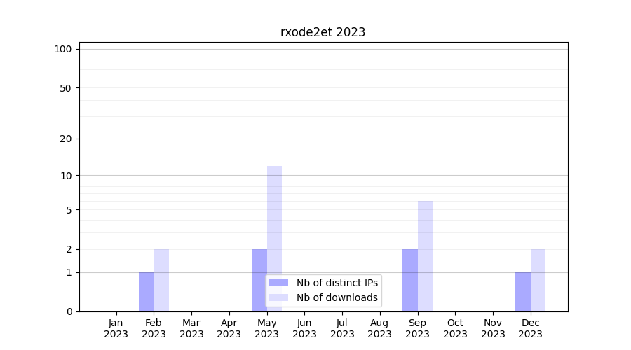 Number of downloads for experiment package rxode2et, year by year, from 2025 back to 2014 (years with no downloads are omitted):