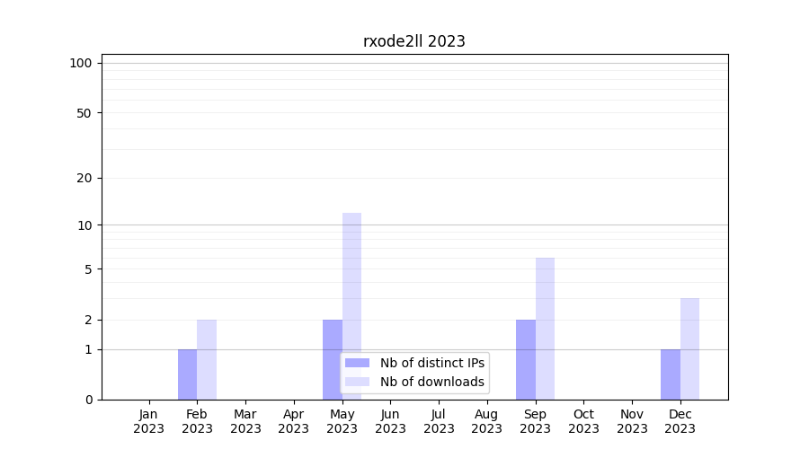 Number of downloads for experiment package rxode2ll, year by year, from 2025 back to 2014 (years with no downloads are omitted):