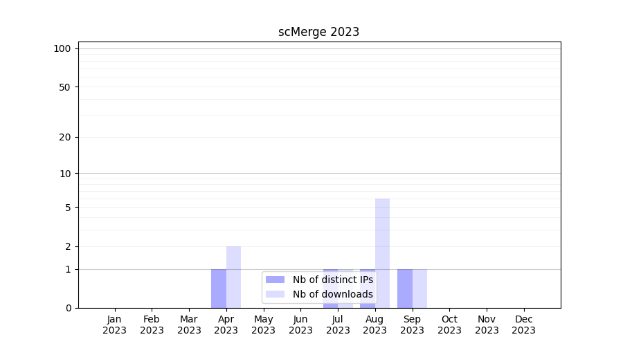 Number of downloads for experiment package scMerge, year by year, from 2025 back to 2014 (years with no downloads are omitted):