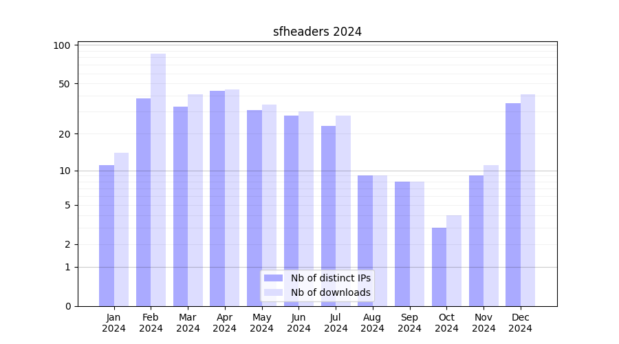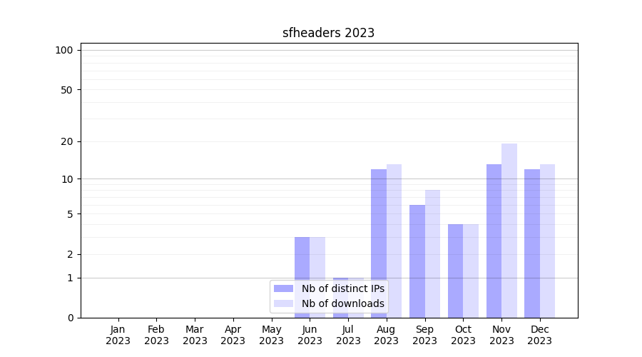 Number of downloads for experiment package sfheaders, year by year, from 2025 back to 2014 (years with no downloads are omitted):