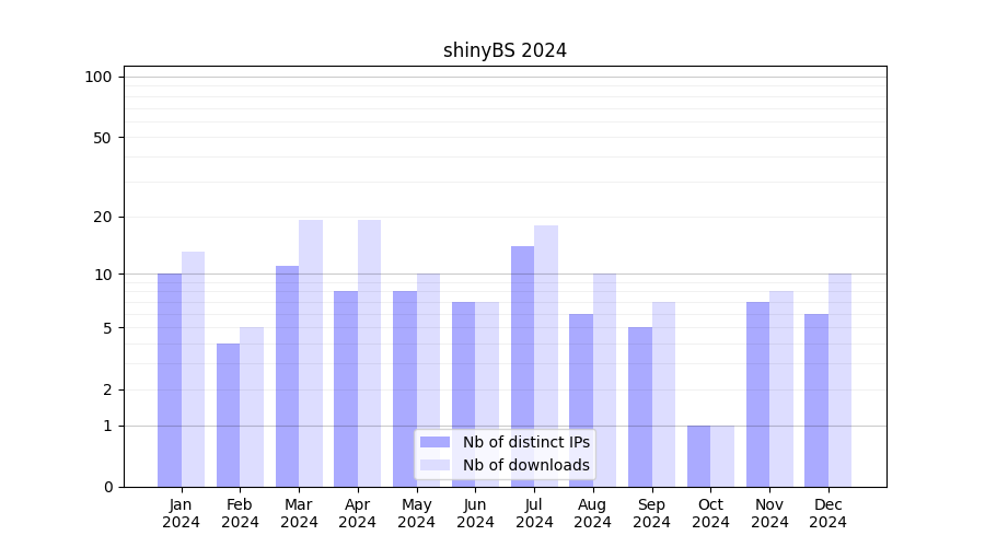 Number of downloads for experiment package shinyBS, year by year, from 2025 back to 2014 (years with no downloads are omitted):
