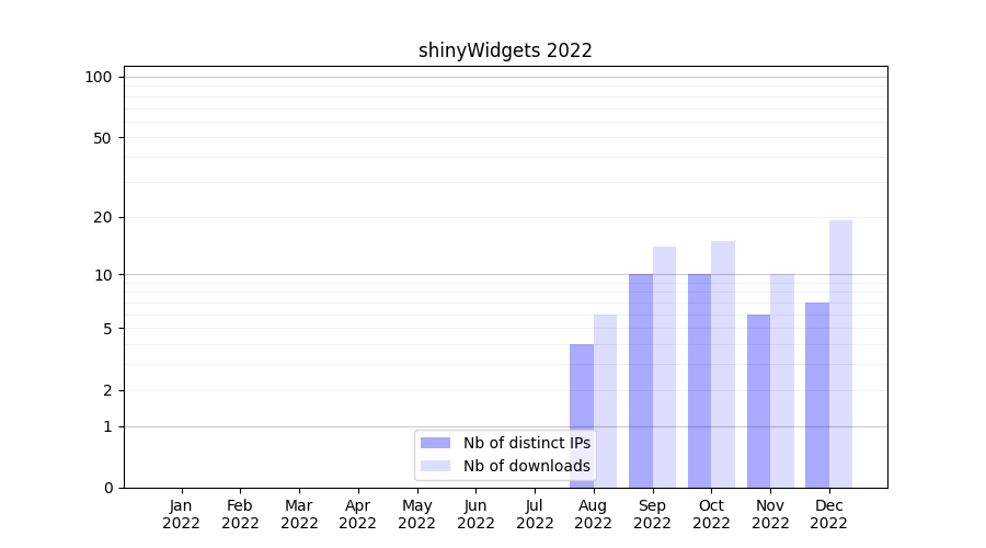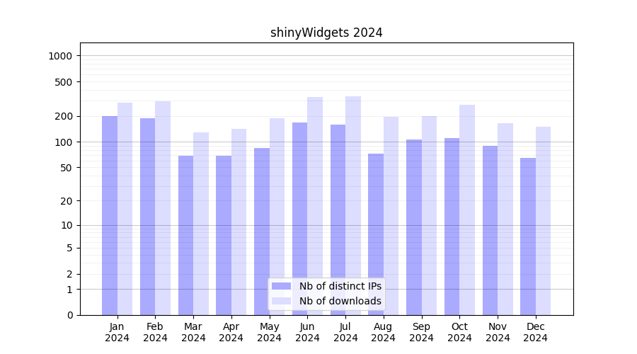 Number of downloads for experiment package shinyWidgets, year by year, from 2025 back to 2014 (years with no downloads are omitted):