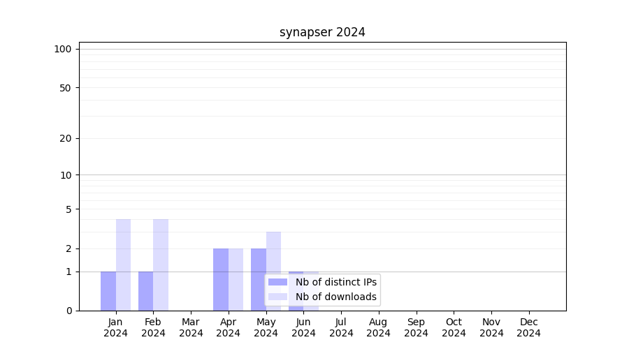 Number of downloads for experiment package synapser, year by year, from 2025 back to 2014 (years with no downloads are omitted):