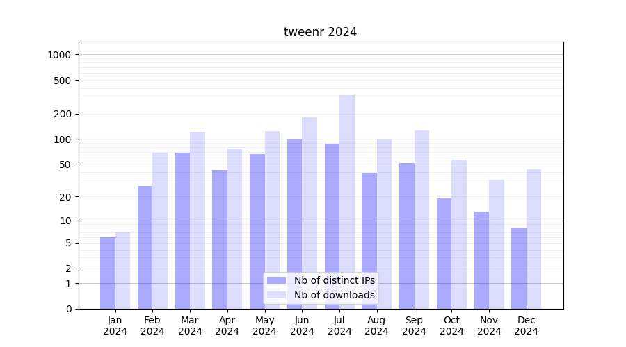 Number of downloads for experiment package tweenr, year by year, from 2025 back to 2014 (years with no downloads are omitted):