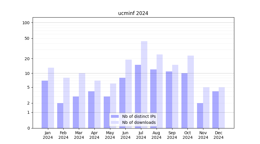 Number of downloads for experiment package ucminf, year by year, from 2025 back to 2014 (years with no downloads are omitted):