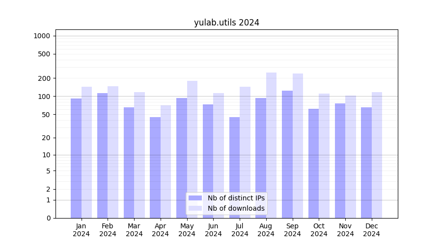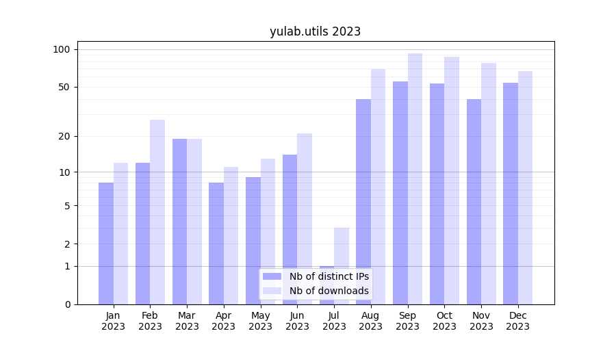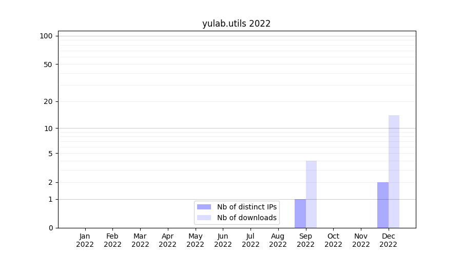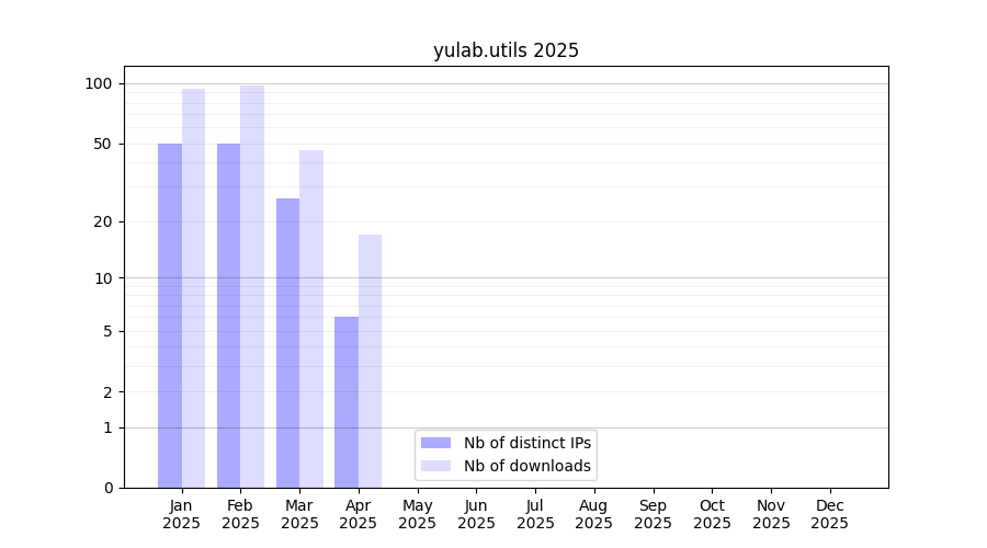 Number of downloads for experiment package yulab.utils, year by year, from 2025 back to 2014 (years with no downloads are omitted):