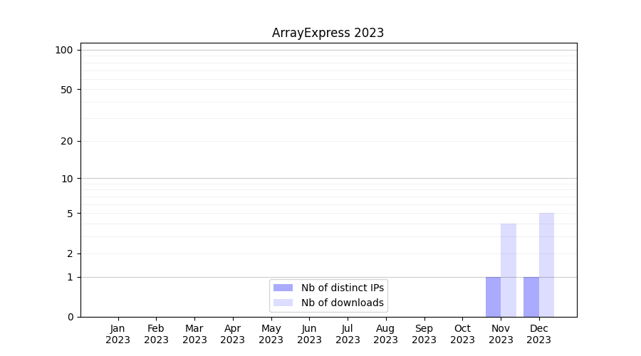 Number of downloads for workflow package ArrayExpress, year by year, from 2025 back to 2015 (years with no downloads are omitted):