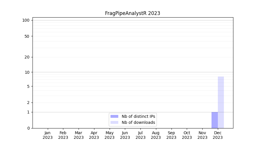 Number of downloads for workflow package FragPipeAnalystR, year by year, from 2025 back to 2015 (years with no downloads are omitted):