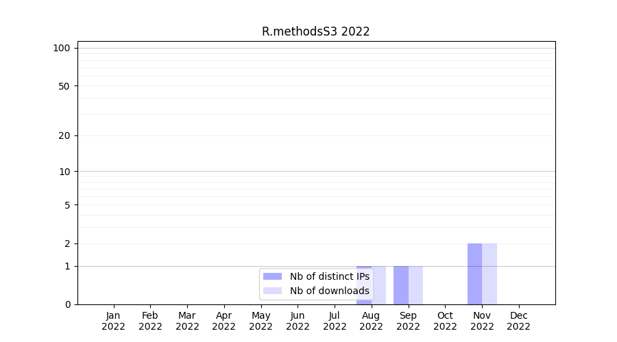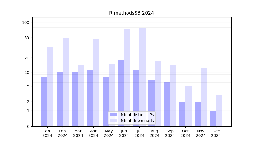 Number of downloads for workflow package R.methodsS3, year by year, from 2025 back to 2015 (years with no downloads are omitted):