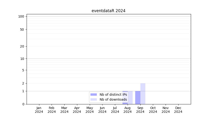 Number of downloads for workflow package eventdataR, year by year, from 2025 back to 2015 (years with no downloads are omitted):