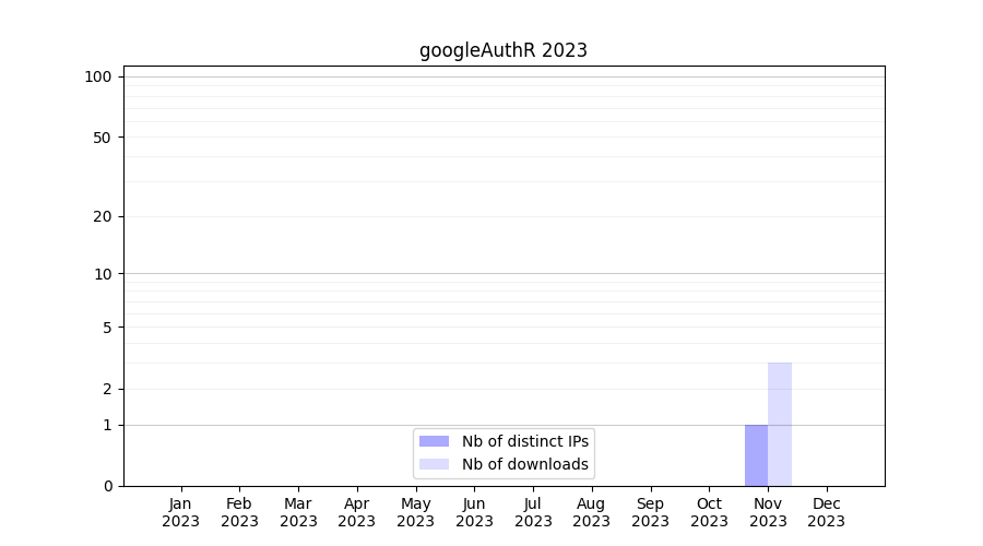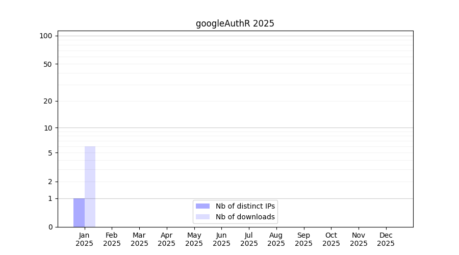 Number of downloads for workflow package googleAuthR, year by year, from 2025 back to 2015 (years with no downloads are omitted):