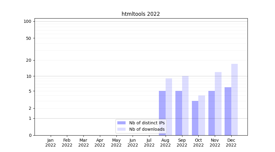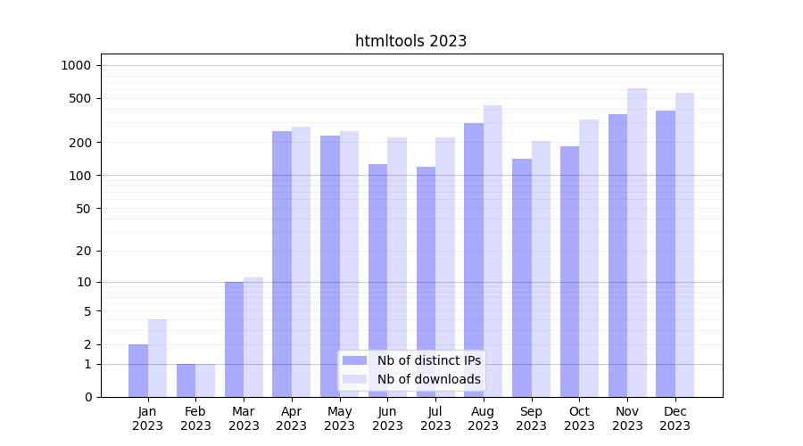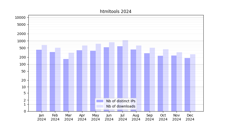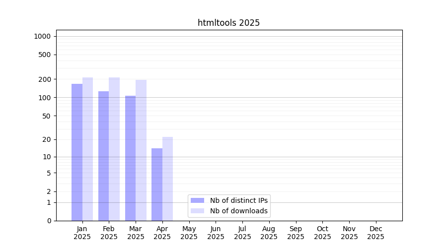 Number of downloads for workflow package htmltools, year by year, from 2025 back to 2015 (years with no downloads are omitted):