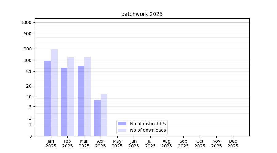 Number of downloads for workflow package patchwork, year by year, from 2025 back to 2015 (years with no downloads are omitted):