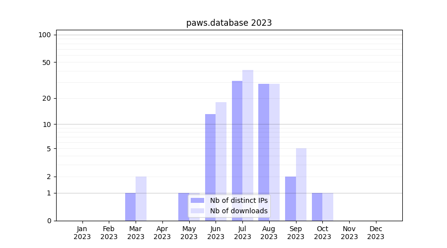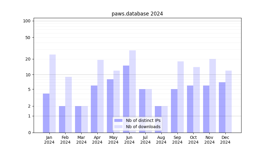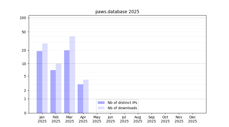 Number of downloads for workflow package paws.database, year by year, from 2025 back to 2015 (years with no downloads are omitted):