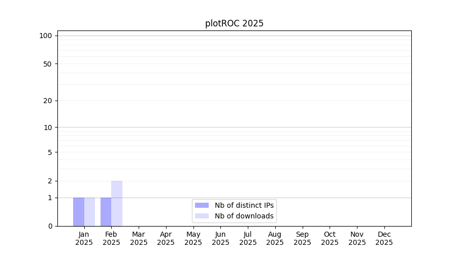 Number of downloads for workflow package plotROC, year by year, from 2025 back to 2015 (years with no downloads are omitted):