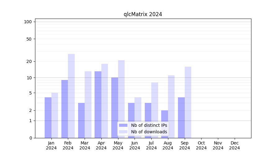 Number of downloads for workflow package qlcMatrix, year by year, from 2025 back to 2015 (years with no downloads are omitted):