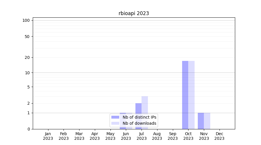 Number of downloads for workflow package rbioapi, year by year, from 2025 back to 2015 (years with no downloads are omitted):