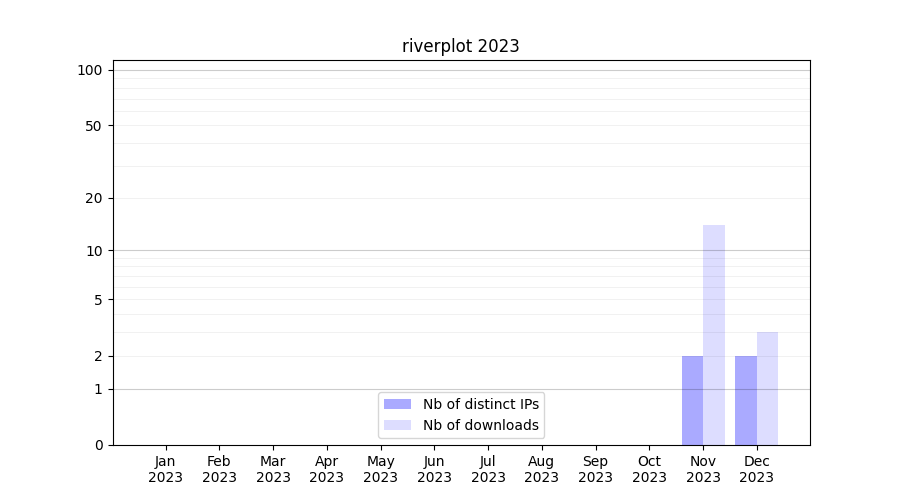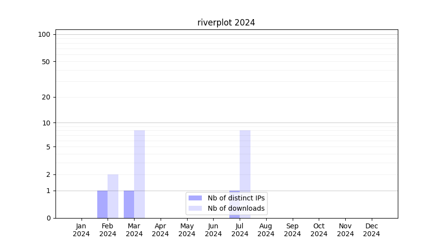 Number of downloads for workflow package riverplot, year by year, from 2025 back to 2015 (years with no downloads are omitted):
