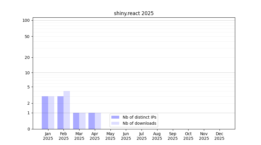 Number of downloads for workflow package shiny.react, year by year, from 2025 back to 2015 (years with no downloads are omitted):
