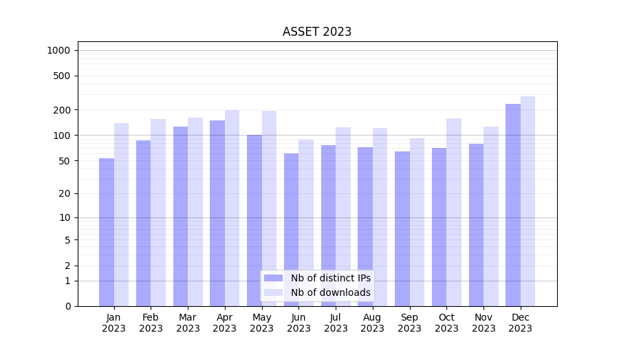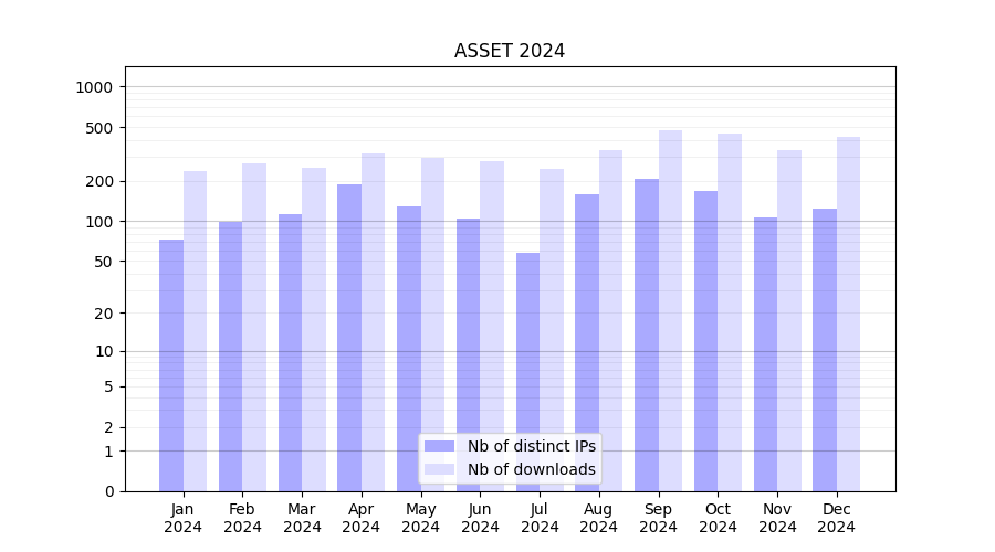 Number of downloads for software package ASSET, year by year, from 2025 back to 2014 (years with no downloads are omitted):