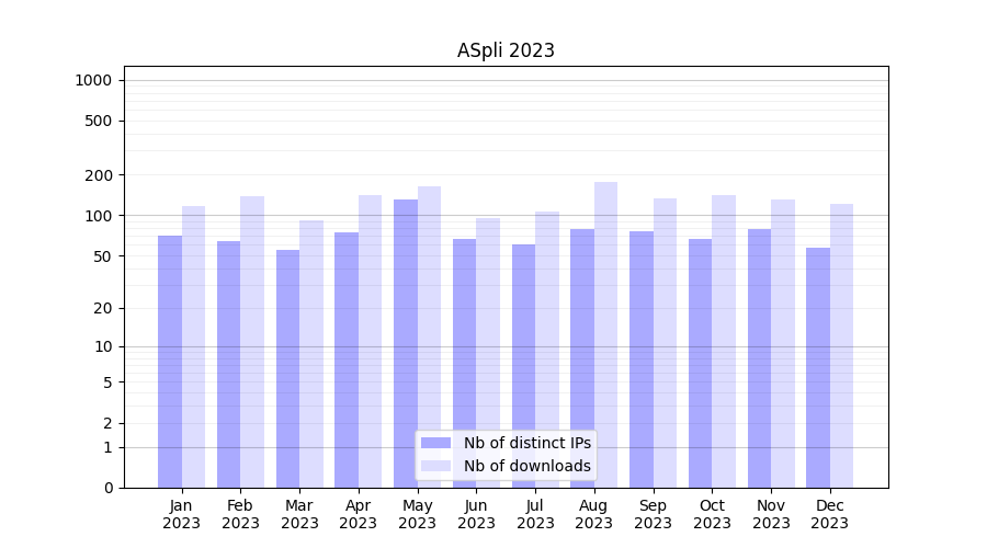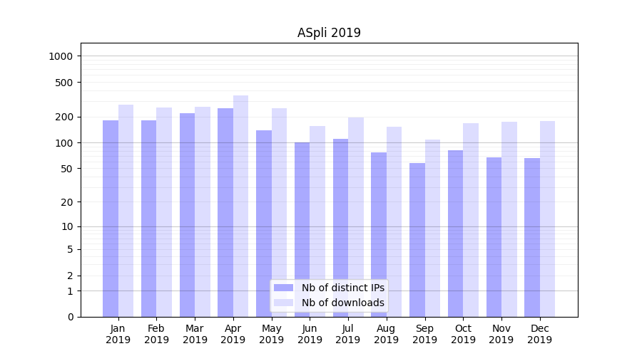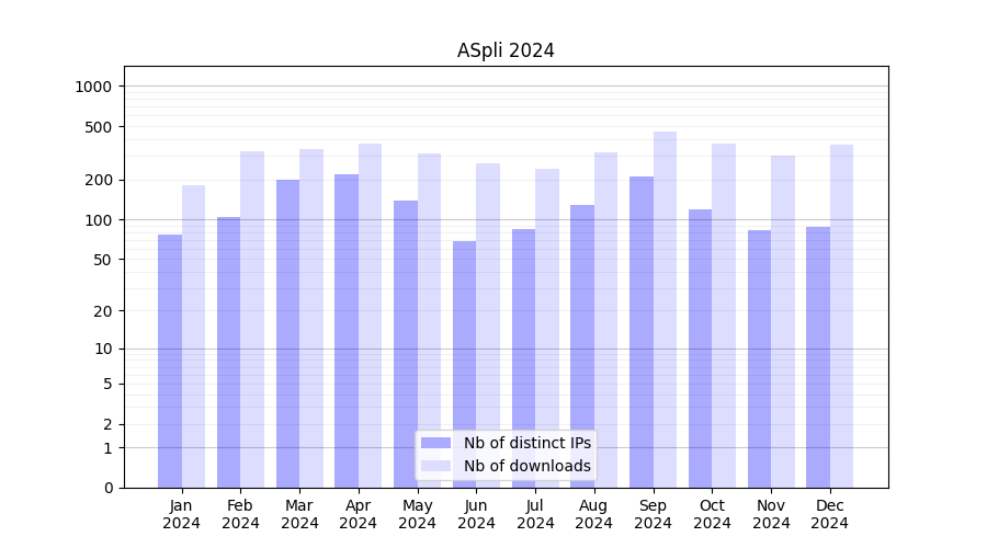 Number of downloads for software package ASpli, year by year, from 2025 back to 2014 (years with no downloads are omitted):