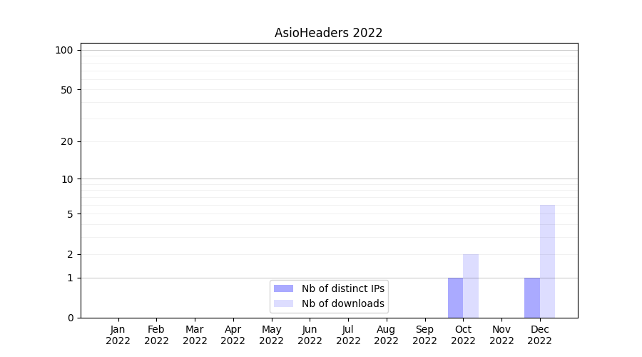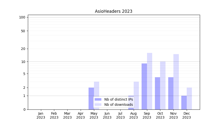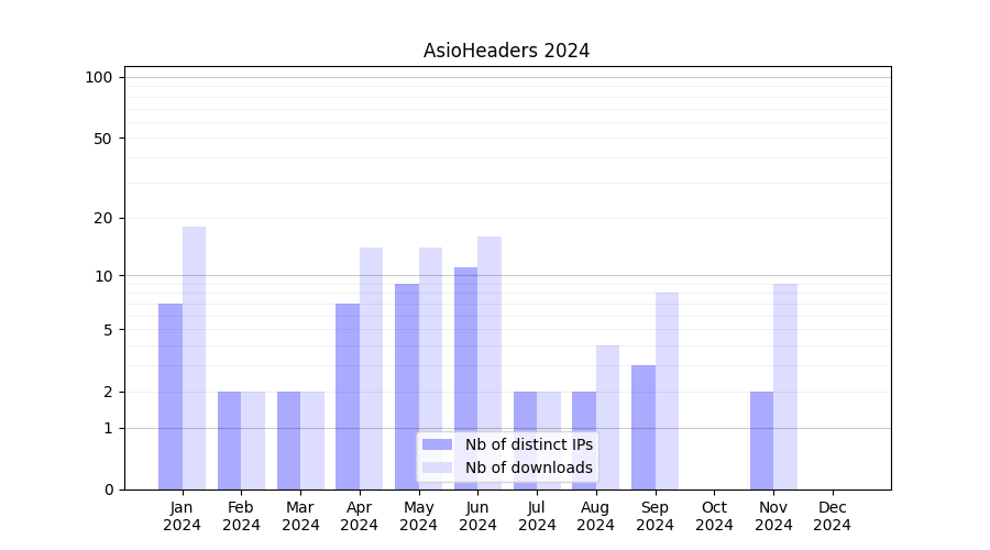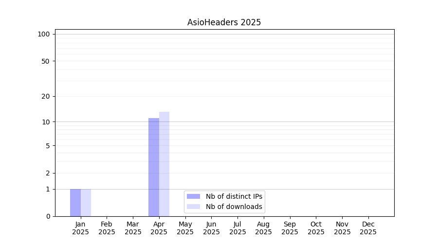 Number of downloads for software package AsioHeaders, year by year, from 2025 back to 2014 (years with no downloads are omitted):