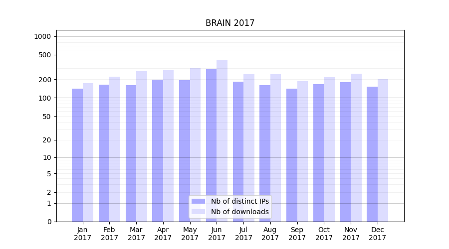 Number of downloads for software package BRAIN, year by year, from 2025 back to 2014 (years with no downloads are omitted):