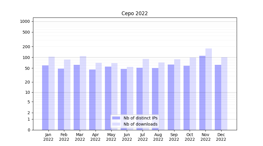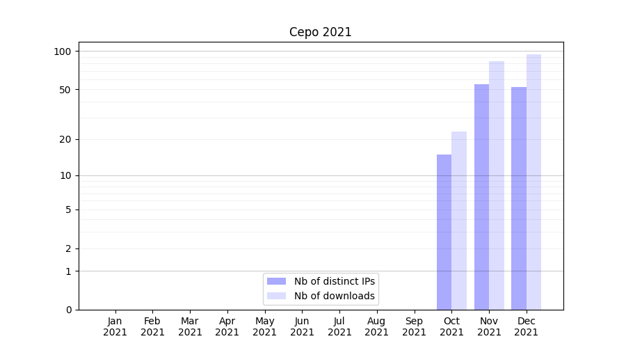 Number of downloads for software package Cepo, year by year, from 2025 back to 2014 (years with no downloads are omitted):