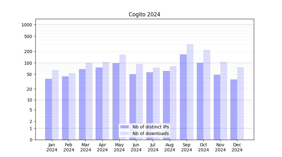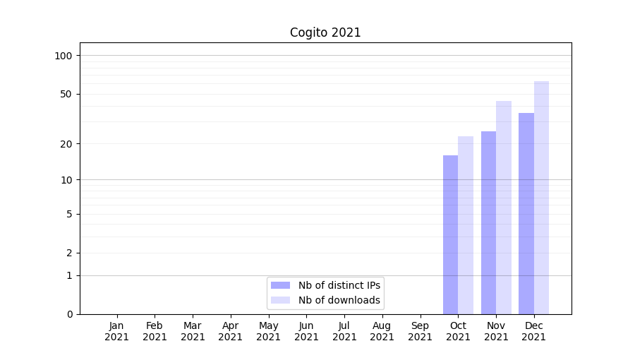 Number of downloads for software package Cogito, year by year, from 2025 back to 2014 (years with no downloads are omitted):