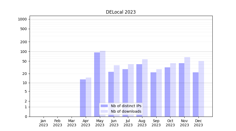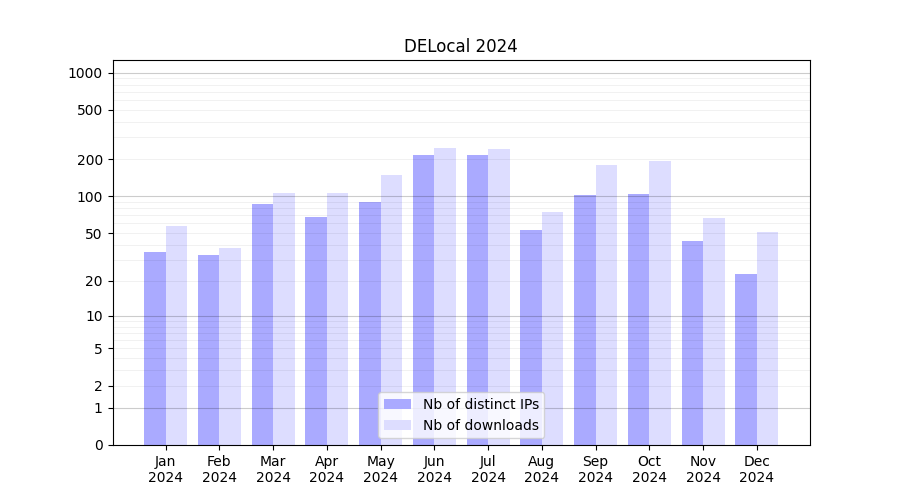 Number of downloads for software package DELocal, year by year, from 2025 back to 2014 (years with no downloads are omitted):