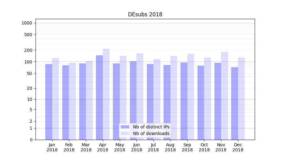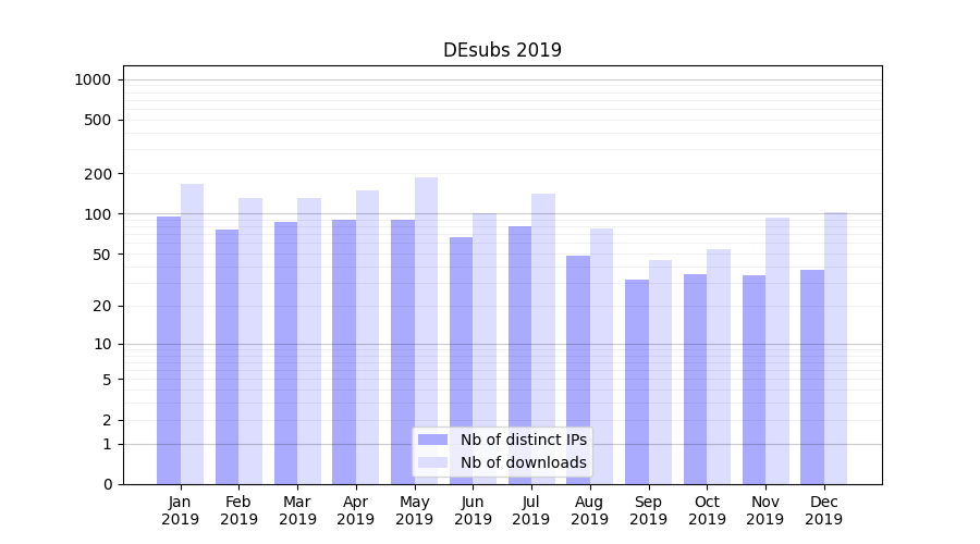 Number of downloads for software package DEsubs, year by year, from 2025 back to 2014 (years with no downloads are omitted):