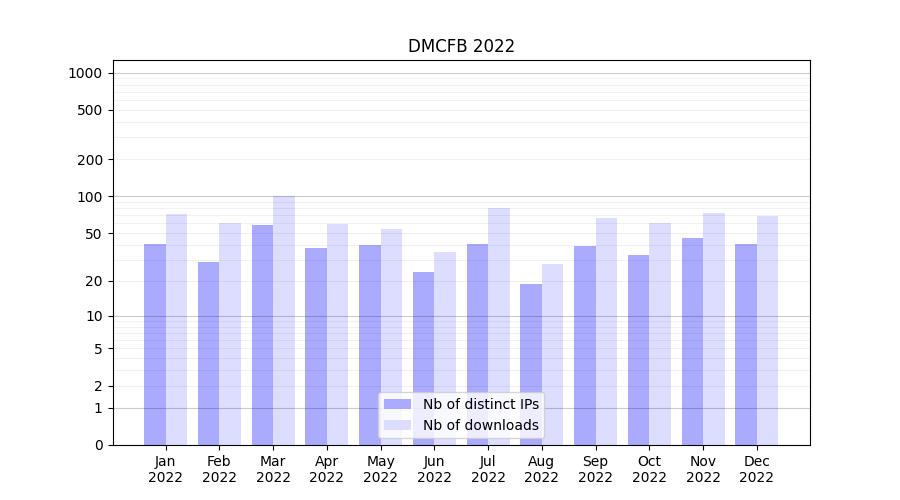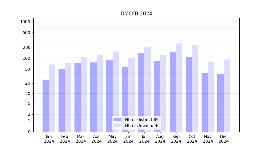 Number of downloads for software package DMCFB, year by year, from 2025 back to 2014 (years with no downloads are omitted):