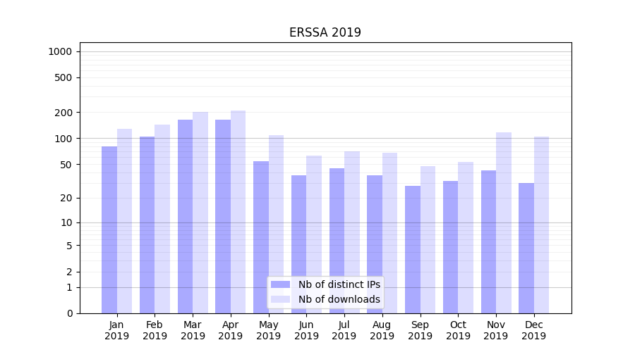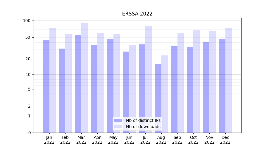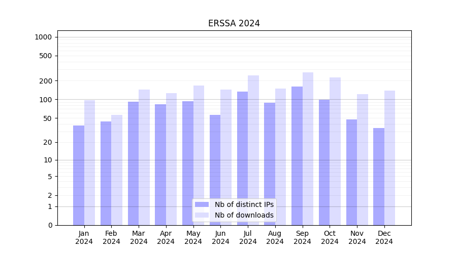 Number of downloads for software package ERSSA, year by year, from 2025 back to 2014 (years with no downloads are omitted):