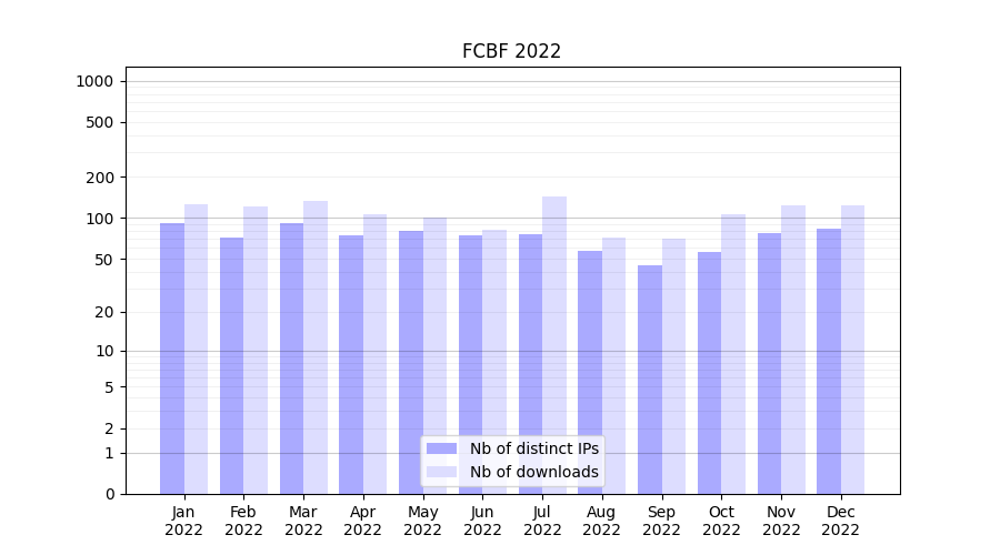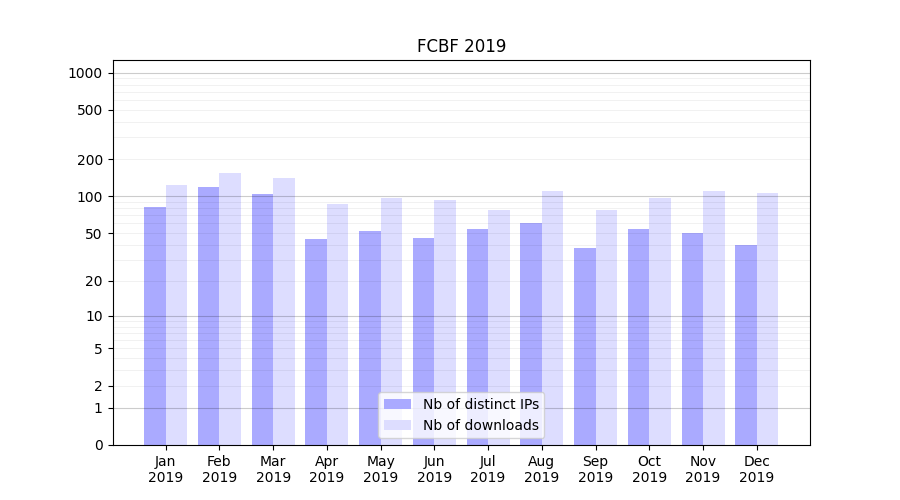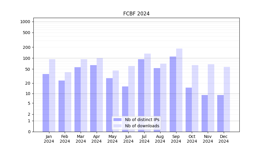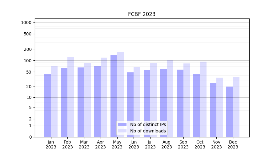 Number of downloads for software package FCBF, year by year, from 2025 back to 2014 (years with no downloads are omitted):
