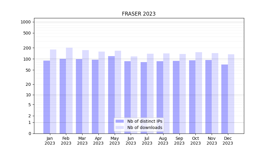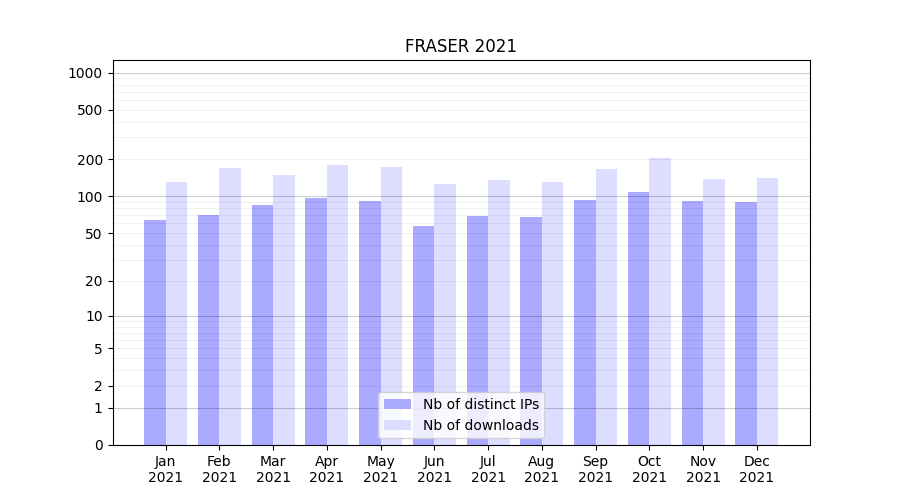 Number of downloads for software package FRASER, year by year, from 2025 back to 2014 (years with no downloads are omitted):