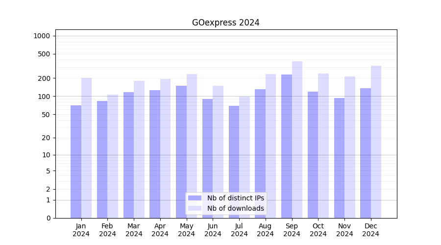 Number of downloads for software package GOexpress, year by year, from 2025 back to 2014 (years with no downloads are omitted):