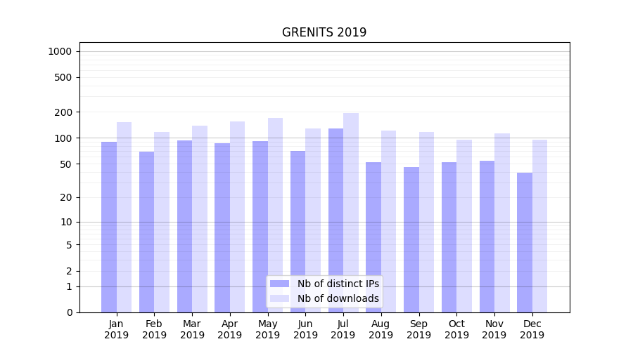Number of downloads for software package GRENITS, year by year, from 2025 back to 2014 (years with no downloads are omitted):
