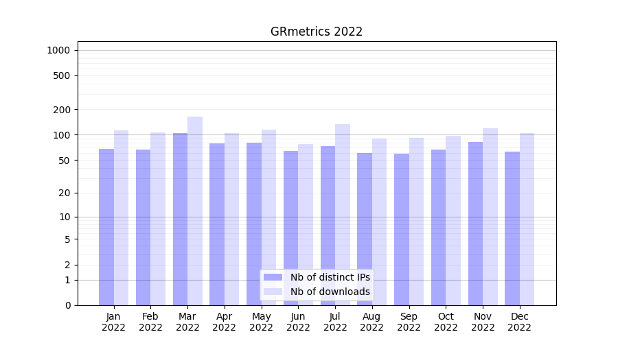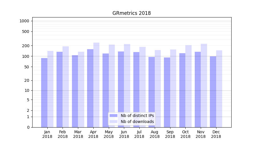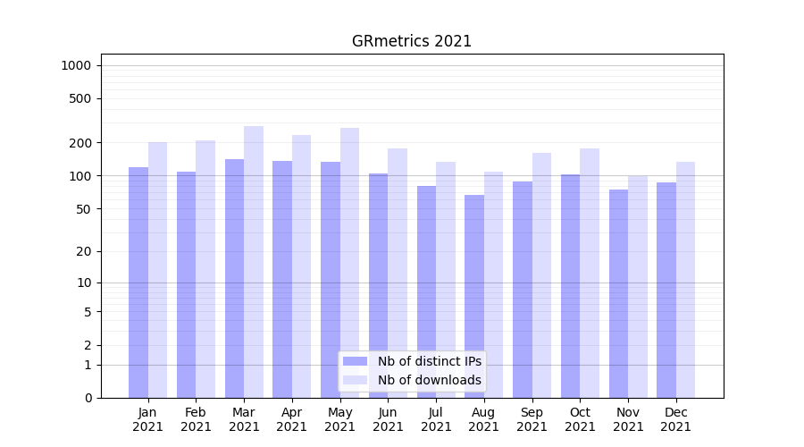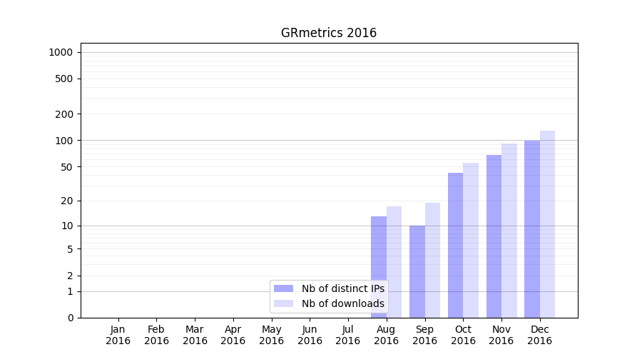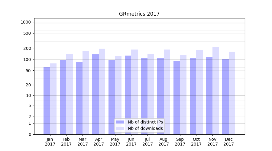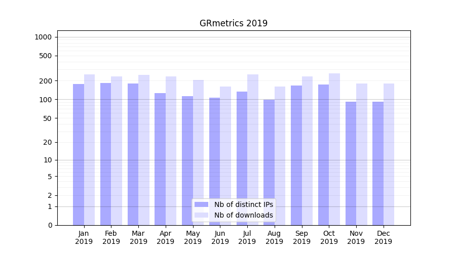 Number of downloads for software package GRmetrics, year by year, from 2025 back to 2014 (years with no downloads are omitted):