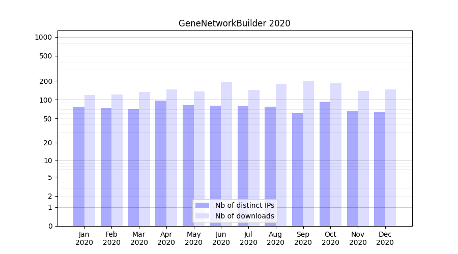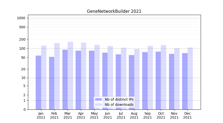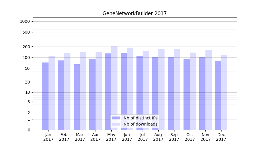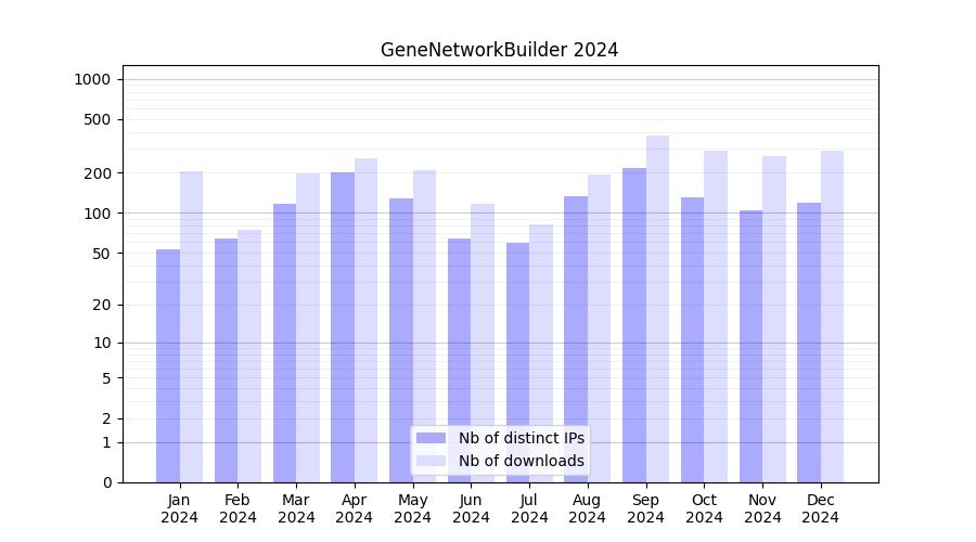 Number of downloads for software package GeneNetworkBuilder, year by year, from 2025 back to 2014 (years with no downloads are omitted):