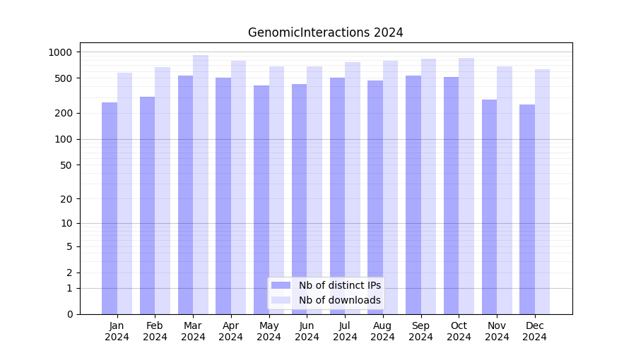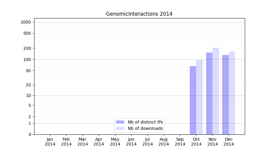 Number of downloads for software package GenomicInteractions, year by year, from 2025 back to 2014 (years with no downloads are omitted):