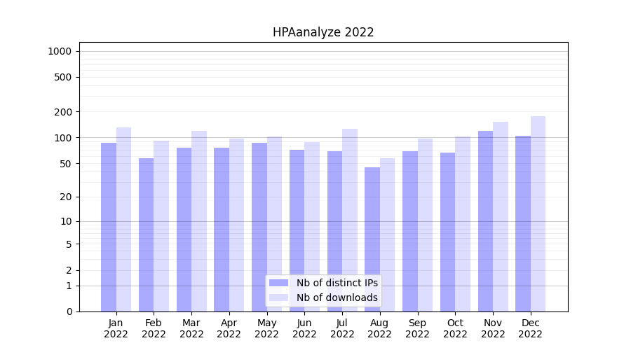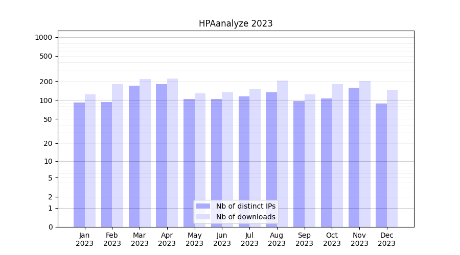 Number of downloads for software package HPAanalyze, year by year, from 2025 back to 2014 (years with no downloads are omitted):