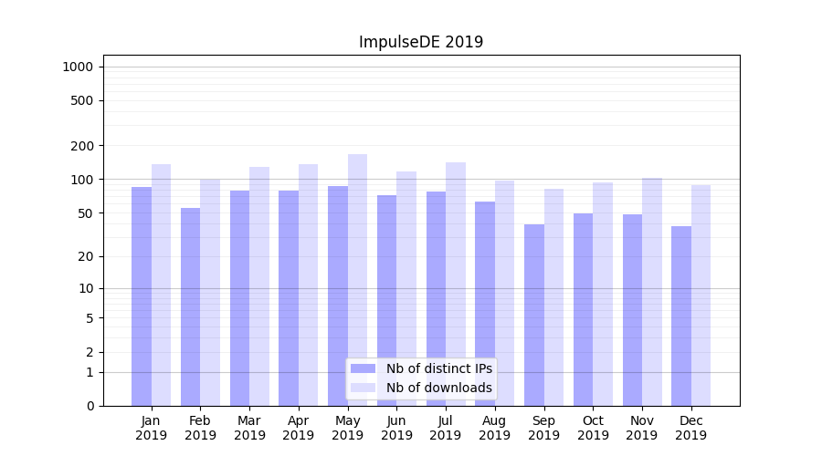 Number of downloads for software package ImpulseDE, year by year, from 2025 back to 2014 (years with no downloads are omitted):