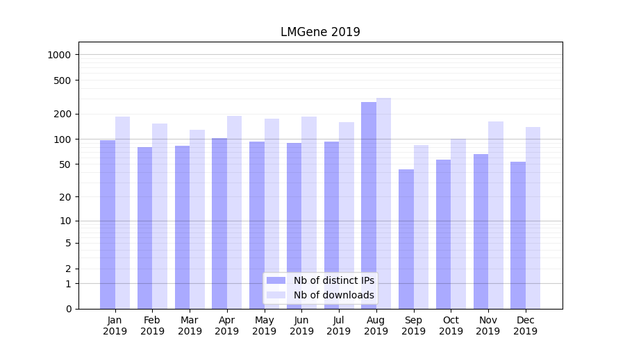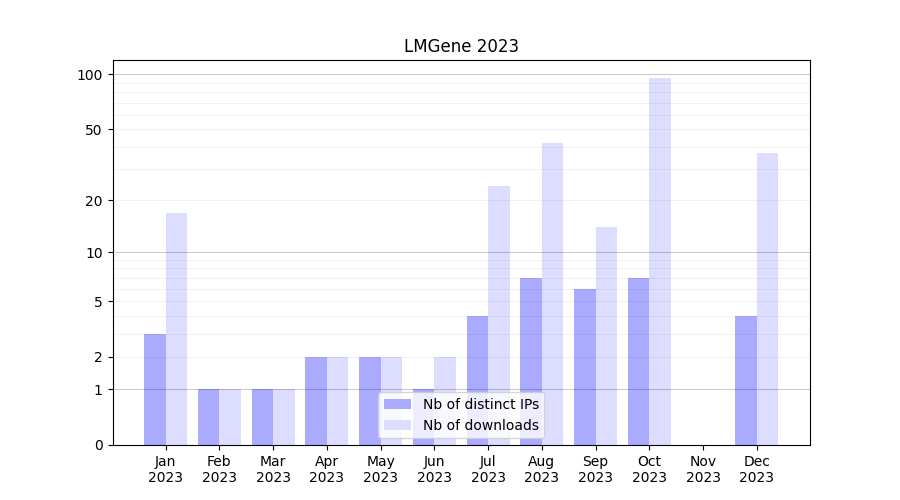 Number of downloads for software package LMGene, year by year, from 2025 back to 2014 (years with no downloads are omitted):