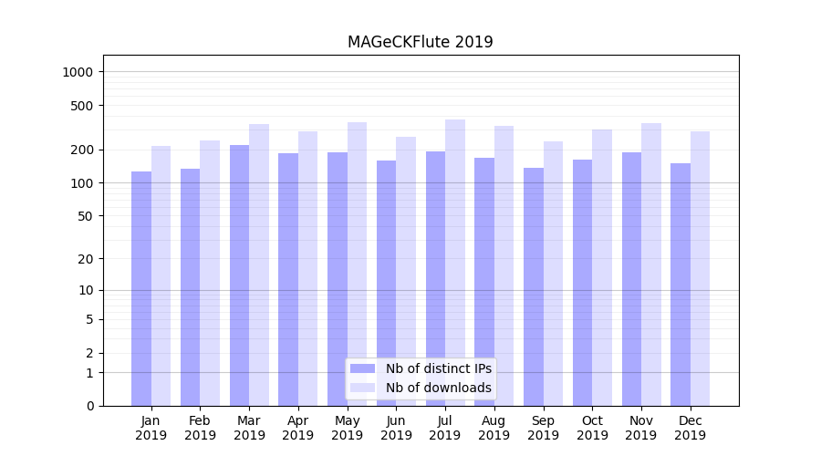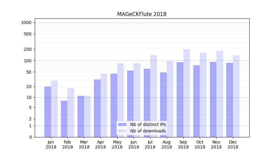 Number of downloads for software package MAGeCKFlute, year by year, from 2025 back to 2014 (years with no downloads are omitted):