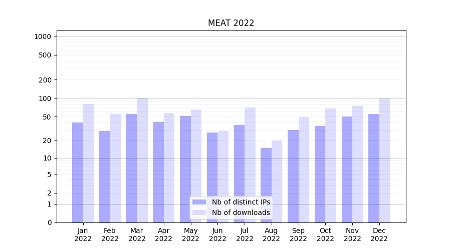 Number of downloads for software package MEAT, year by year, from 2025 back to 2014 (years with no downloads are omitted):