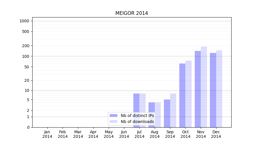 Number of downloads for software package MEIGOR, year by year, from 2025 back to 2014 (years with no downloads are omitted):