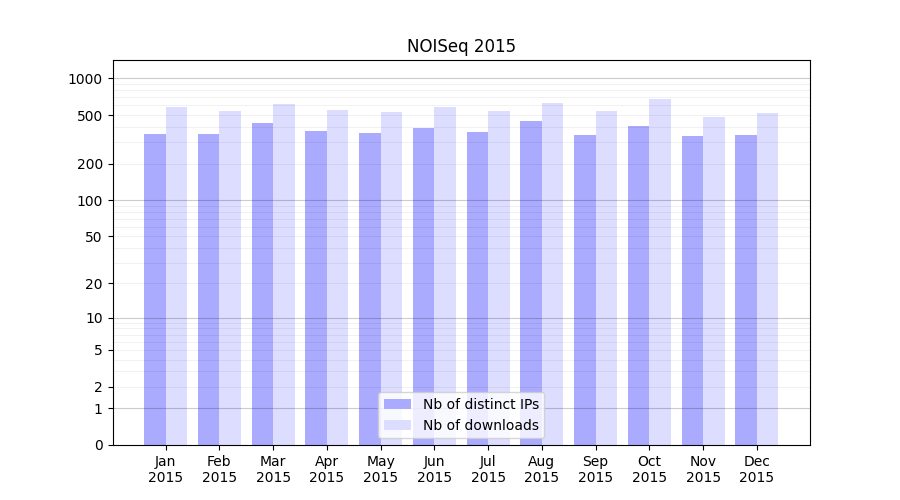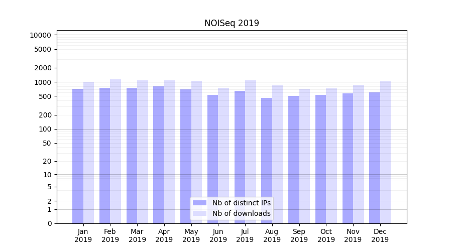 Number of downloads for software package NOISeq, year by year, from 2025 back to 2014 (years with no downloads are omitted):