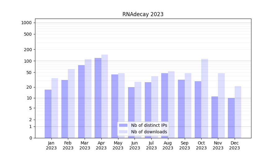 Number of downloads for software package RNAdecay, year by year, from 2025 back to 2014 (years with no downloads are omitted):