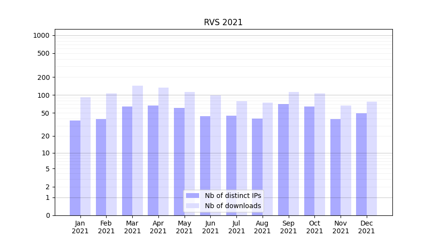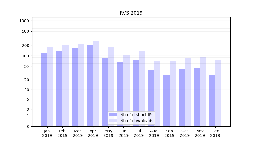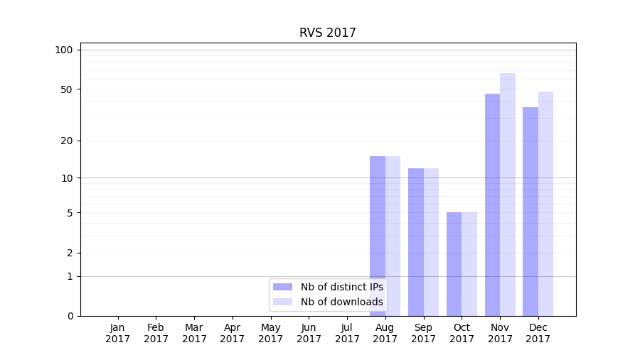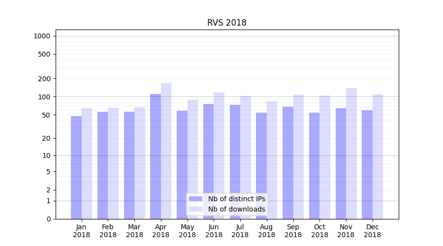 Number of downloads for software package RVS, year by year, from 2025 back to 2014 (years with no downloads are omitted):