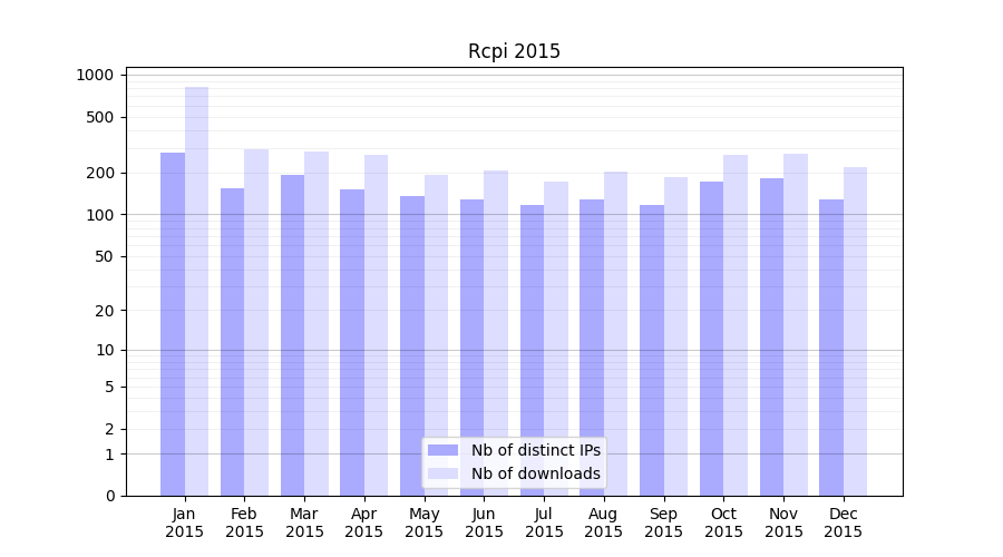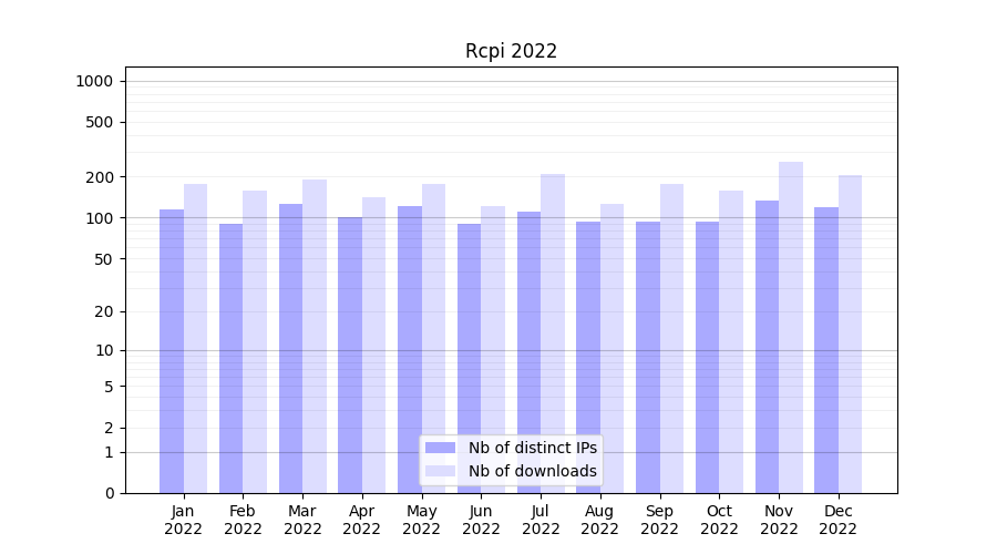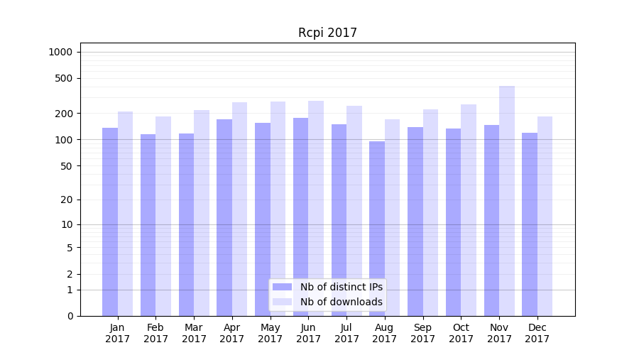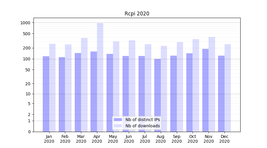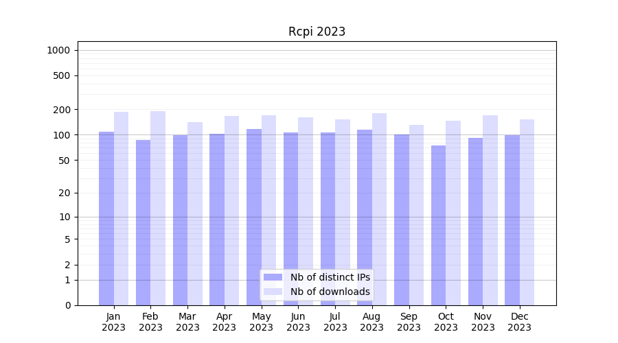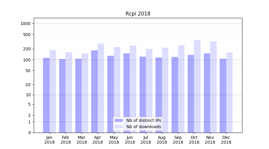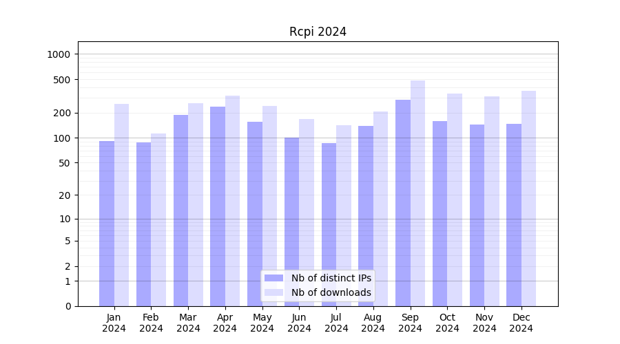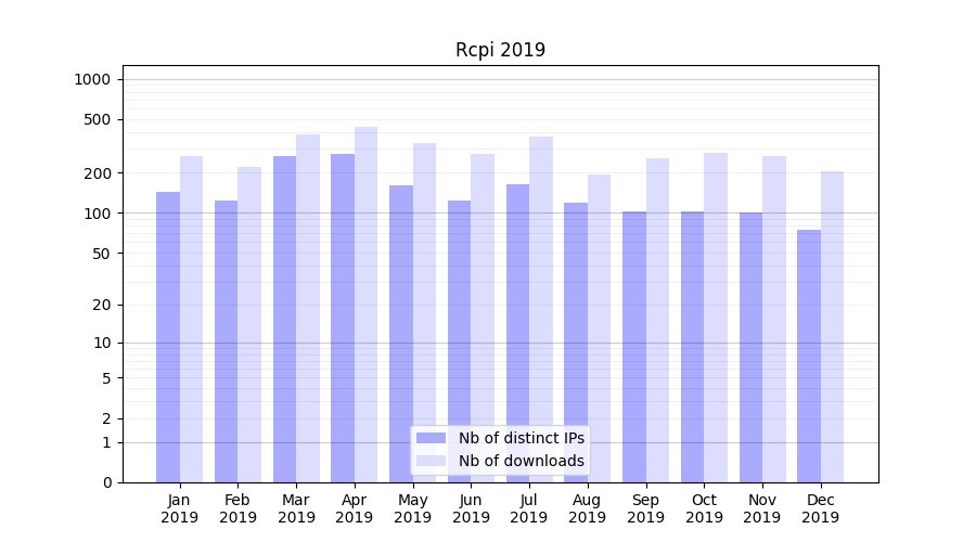 Number of downloads for software package Rcpi, year by year, from 2025 back to 2014 (years with no downloads are omitted):